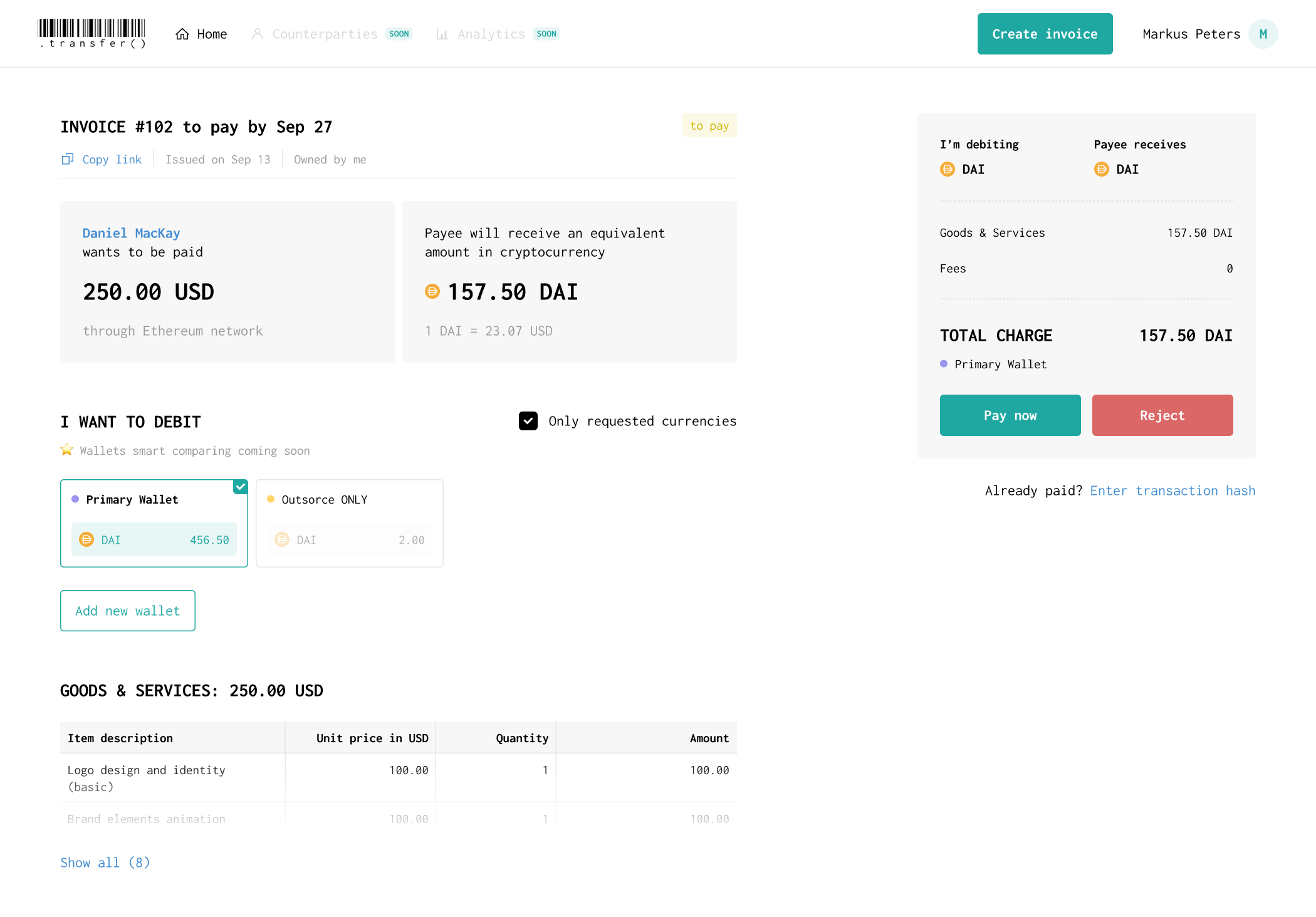 Transfer – сервис для выставления и оплаты счетов через криптовалюту